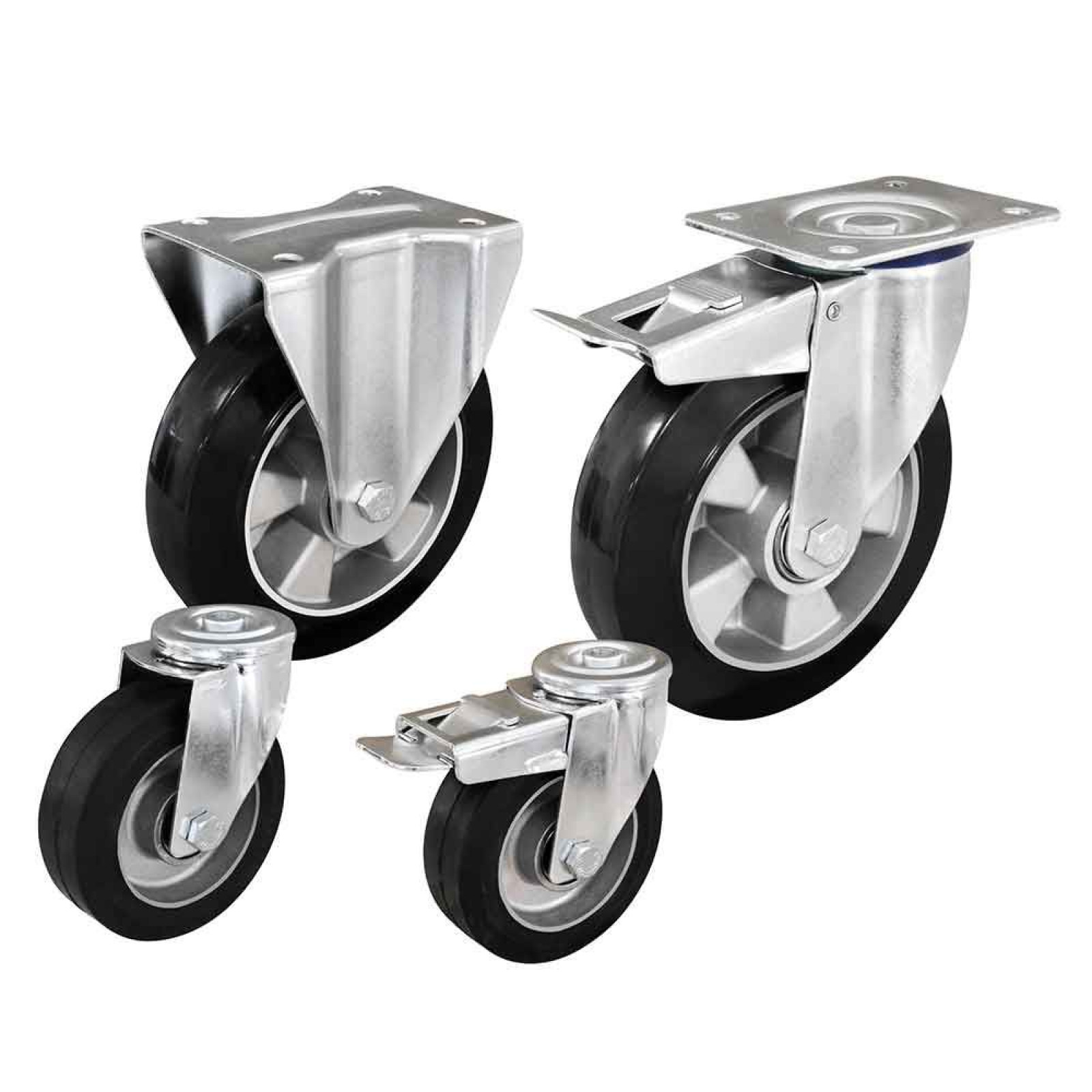 Gummibanen er vulkaniseret på et aluminiumscenter. Monteret i galvaniserede og rivetterede gafler med dobbelt kuglekrans i drejeled og bremsegafler med lås på både drejefunktion og hjul.