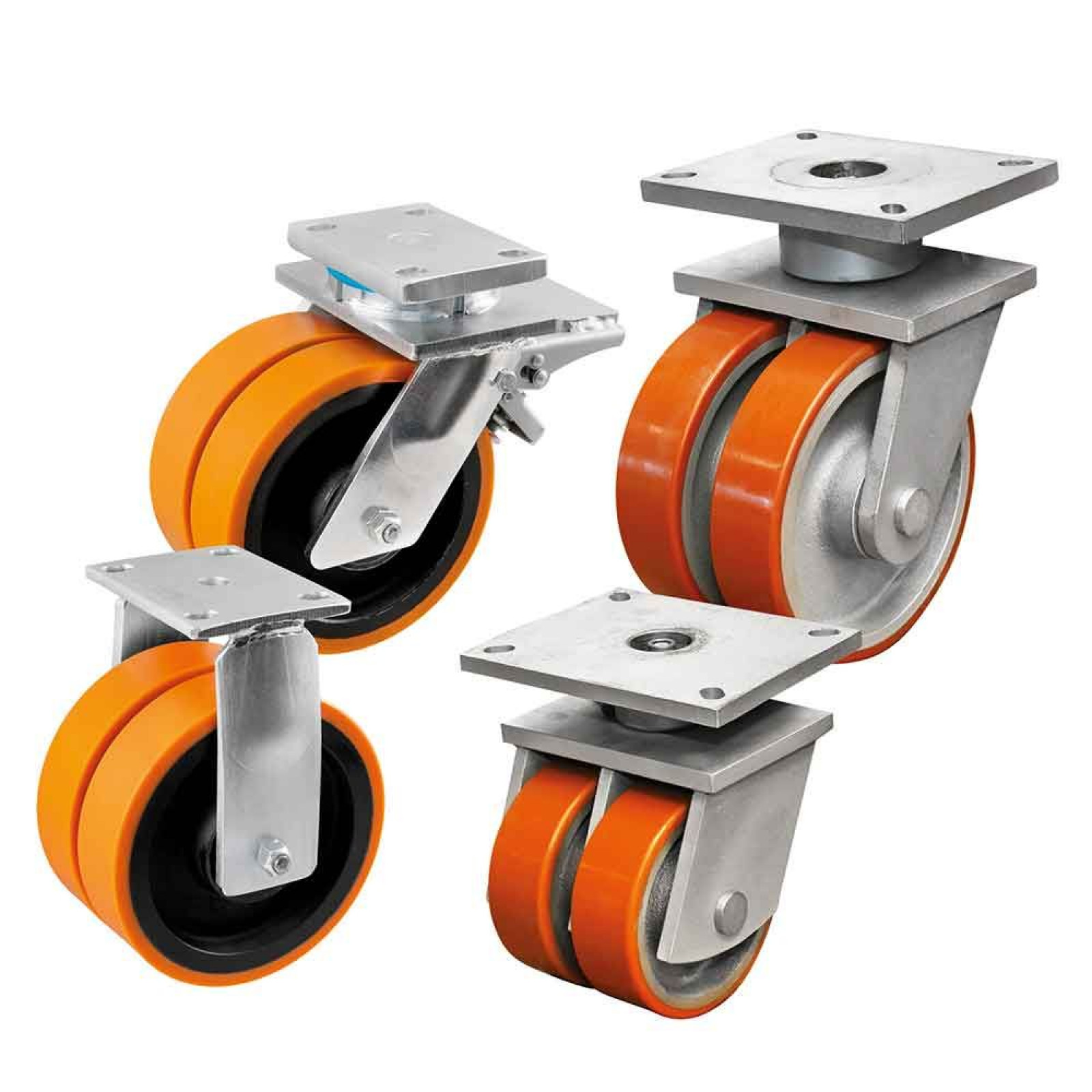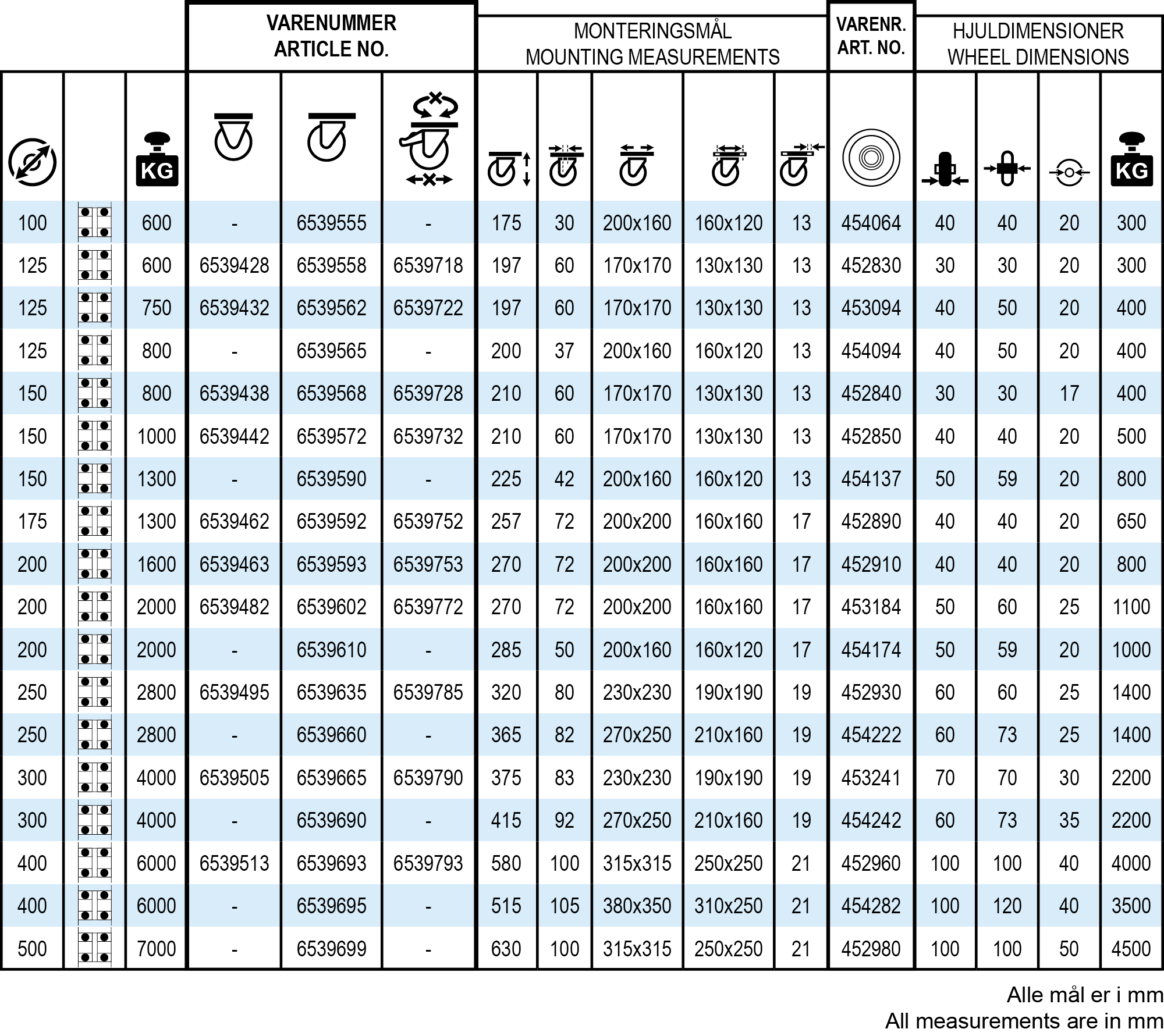 Super kraftige, svejste gafler med dobbelt konisk rulleleje i drejeled, bremsegafler låser kun hjulene.