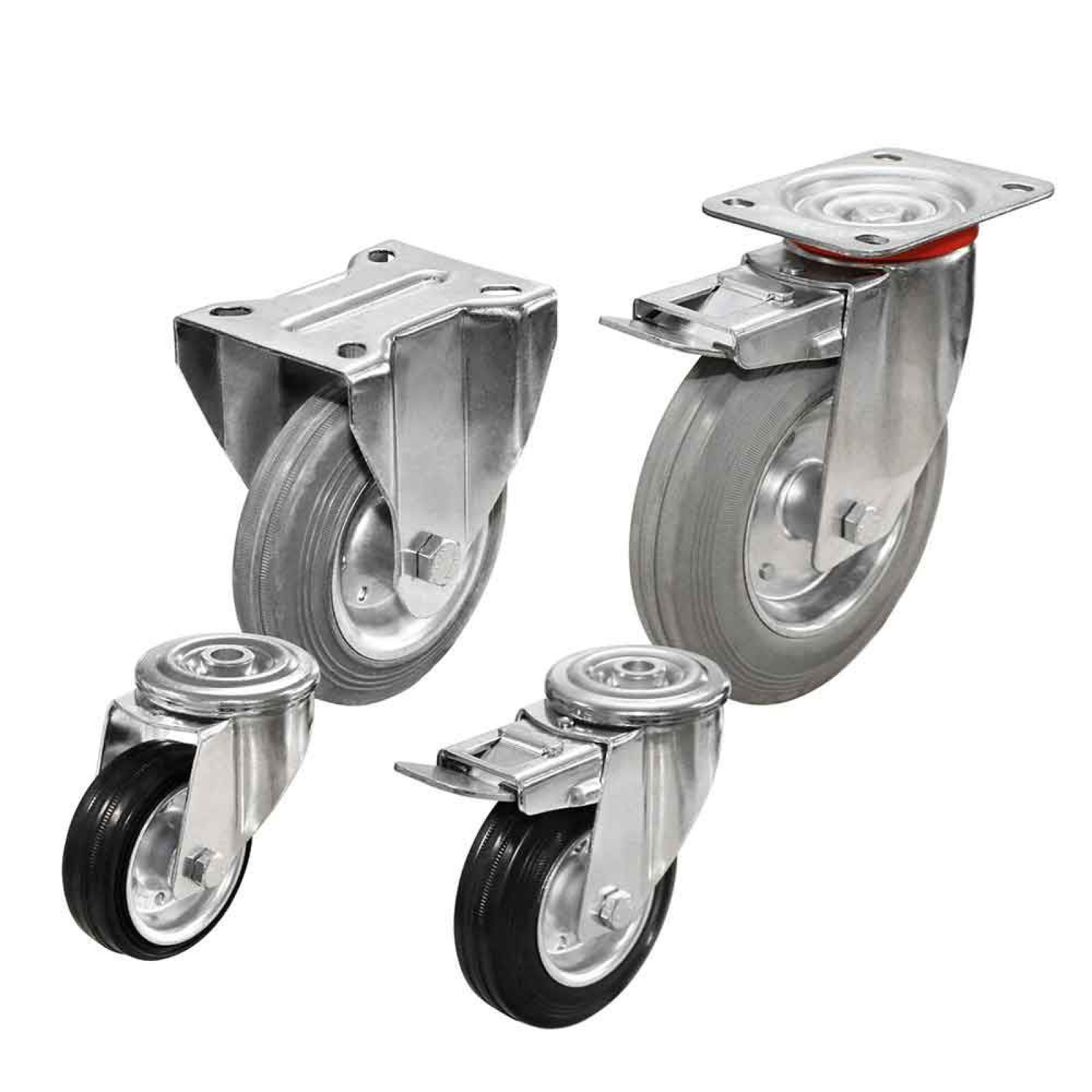 Gummihjul med galvaniseret stålfælg og en gummibane shore 85A +/-3. Hjulene er meget alsidige, og bliver anvendt på mange forskellige transportenheder. Gummihjulene er monteret i galvaniserede og rivetterede gafler med dobbelt kuglekrans i drejeled. Bremsegaflerne er med lås på både hjul og drejefunktion.