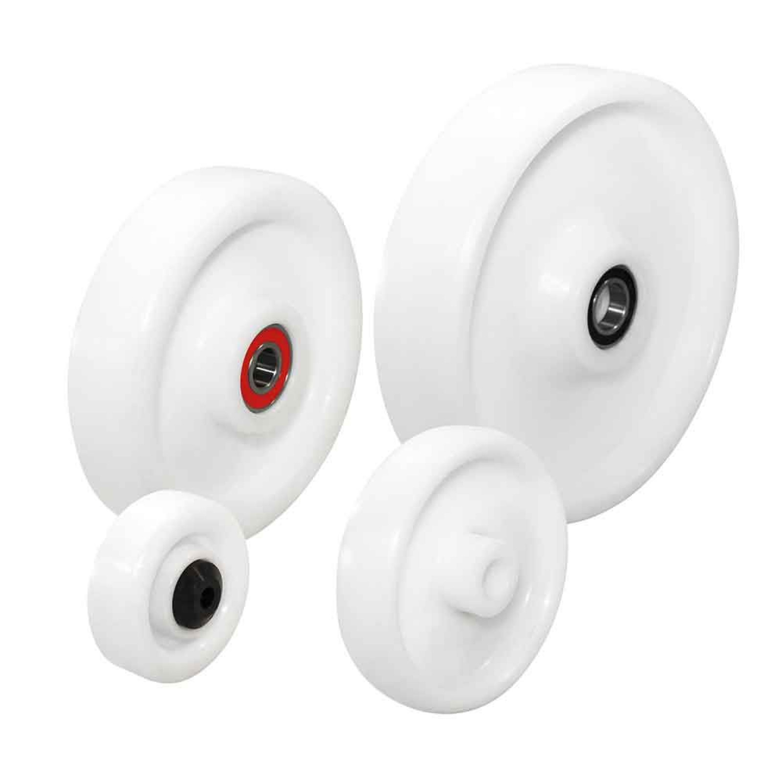 Hvide kunststofhjul af polypropylene shore 62D +/-2. Kan leveres i andre farver på forespørgsel.