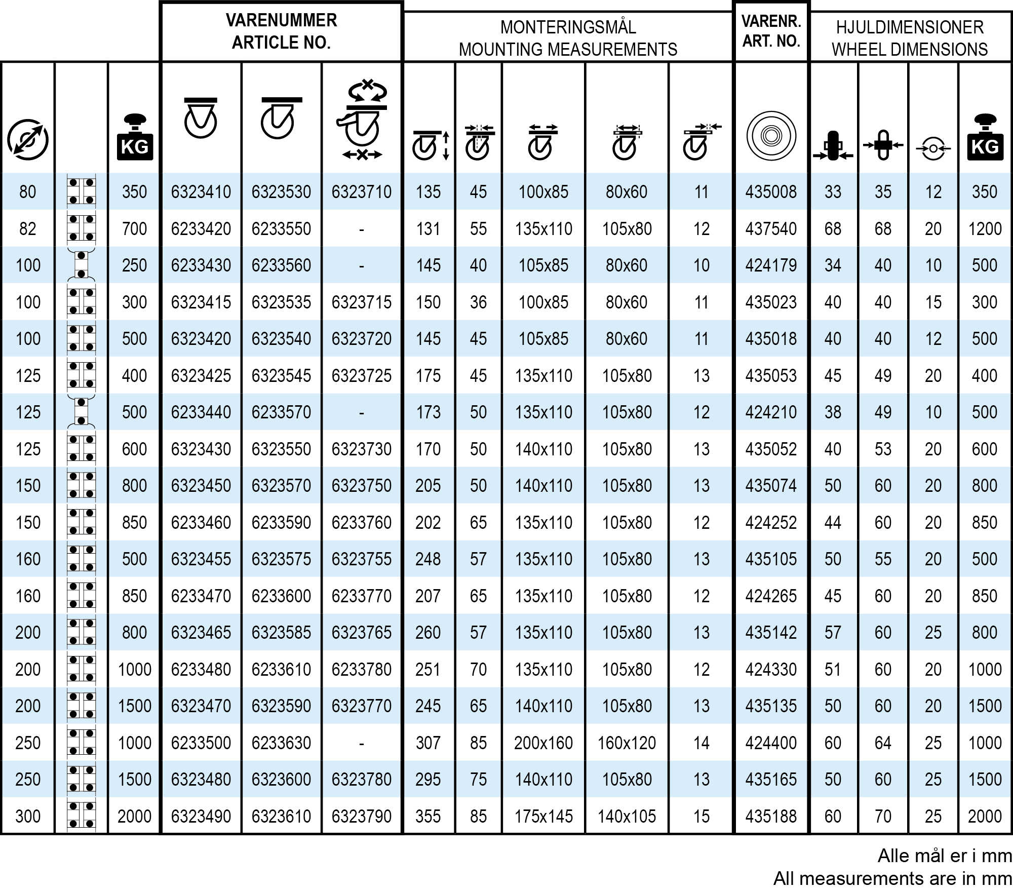 Kraftige, svejste og dybdetrukne gafler med axial kugleleje og konisk rulleleje i drejeled, bremsegafler med lås på både hjul og drejefunktion.