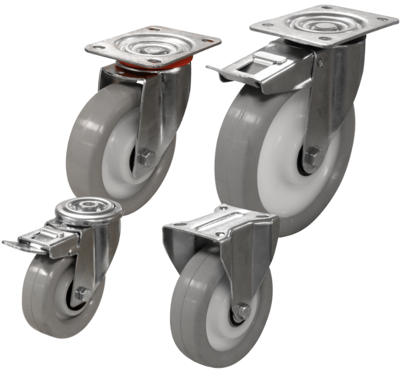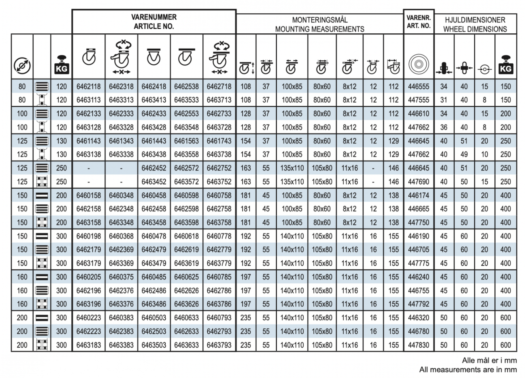 Middelsvære, galvaniserede gafler. Type 1 med dobbelt kuglekrans i hærdede lejeskåle med centerbolt. Type 2 med vandtæt lejehus uden centerbolt og med smørenippel. Bremsegafler med lås på både hjul og drejefunktion.