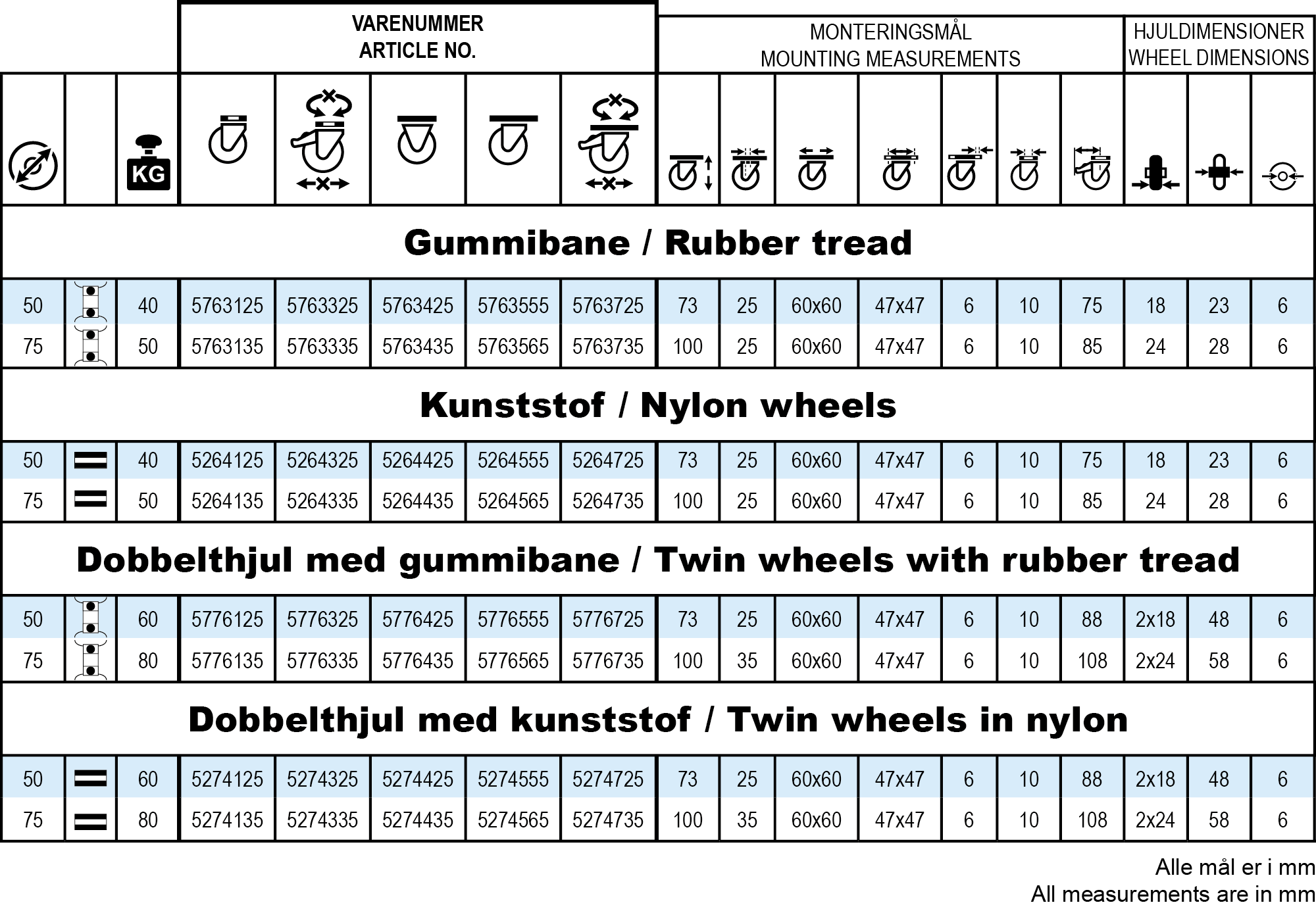 Apparathjul med sort, afsmitningsfri gummibane og kunststofcenter, eller helstøbte kunststofhjul.