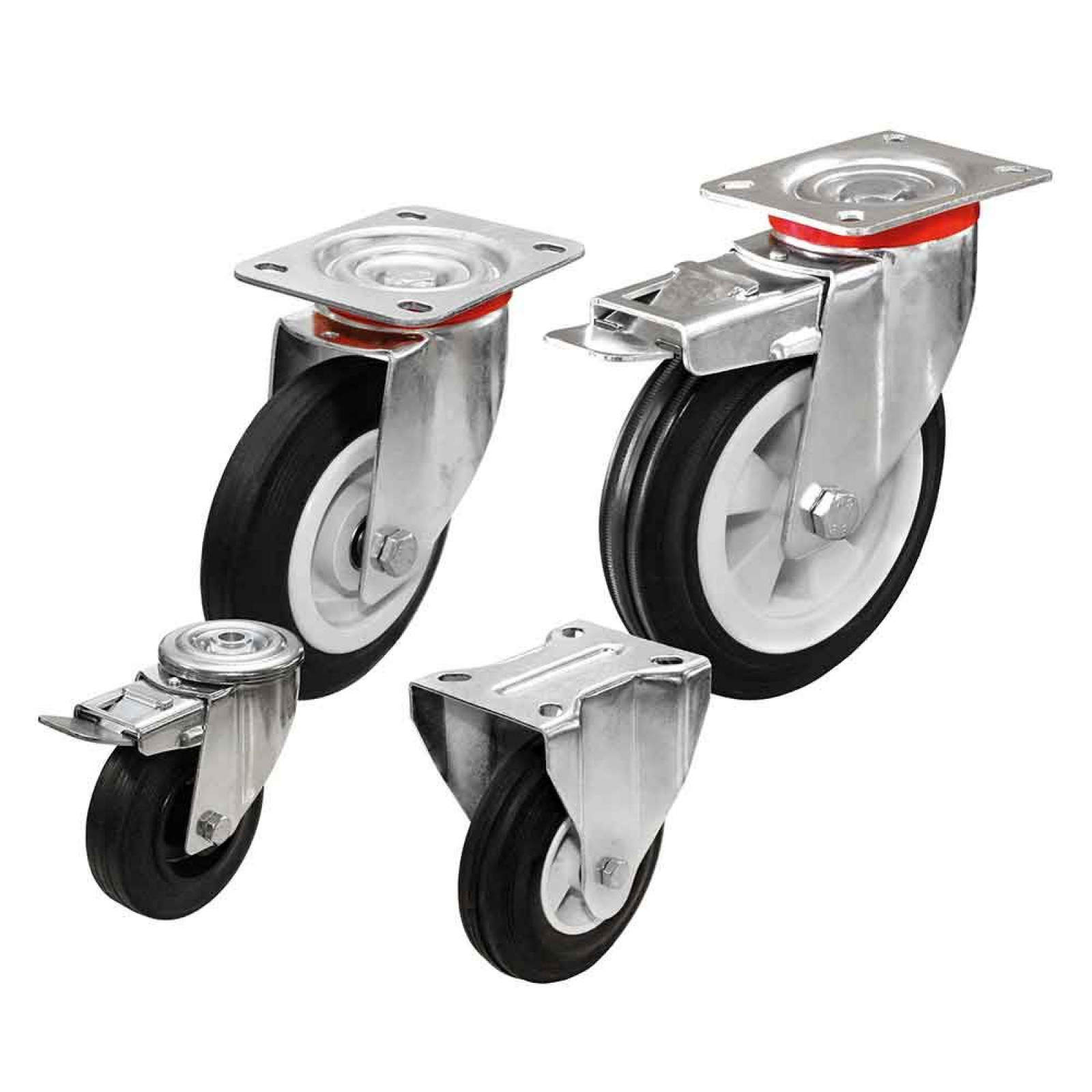 Vores sorte gummihjul er meget alsidige, og anvendes rigtig mange steder. Gummihjulene er shore 85A +/-3 med kunststoffælg. Hjulgaflerne er galvaniserede og rivetterede med dobbelt kuglekrans i drejeled. Bremsegaflerne er med lås på både hjul og drejefunktion.