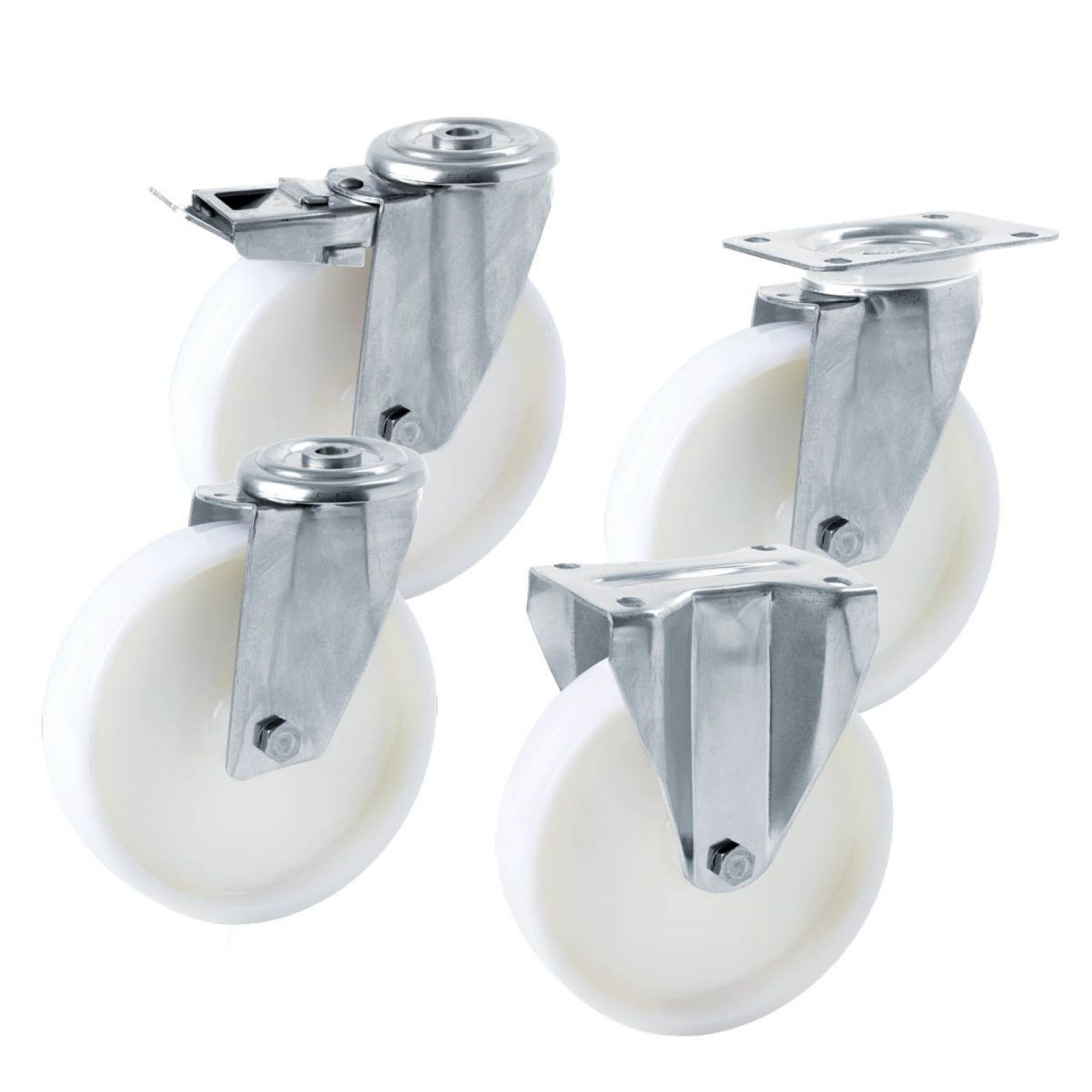 De syrefaste hjulgafler findes i forskellige variationer og kan kombineres med mange forskellige hjultyper, så de matcher lige netop dit behov. Hjulene er smurt med specialfedt der er holdbar fra -40°C til +280°C, hvilket gør at hjulene kan anvendes under alle klimaforhold.