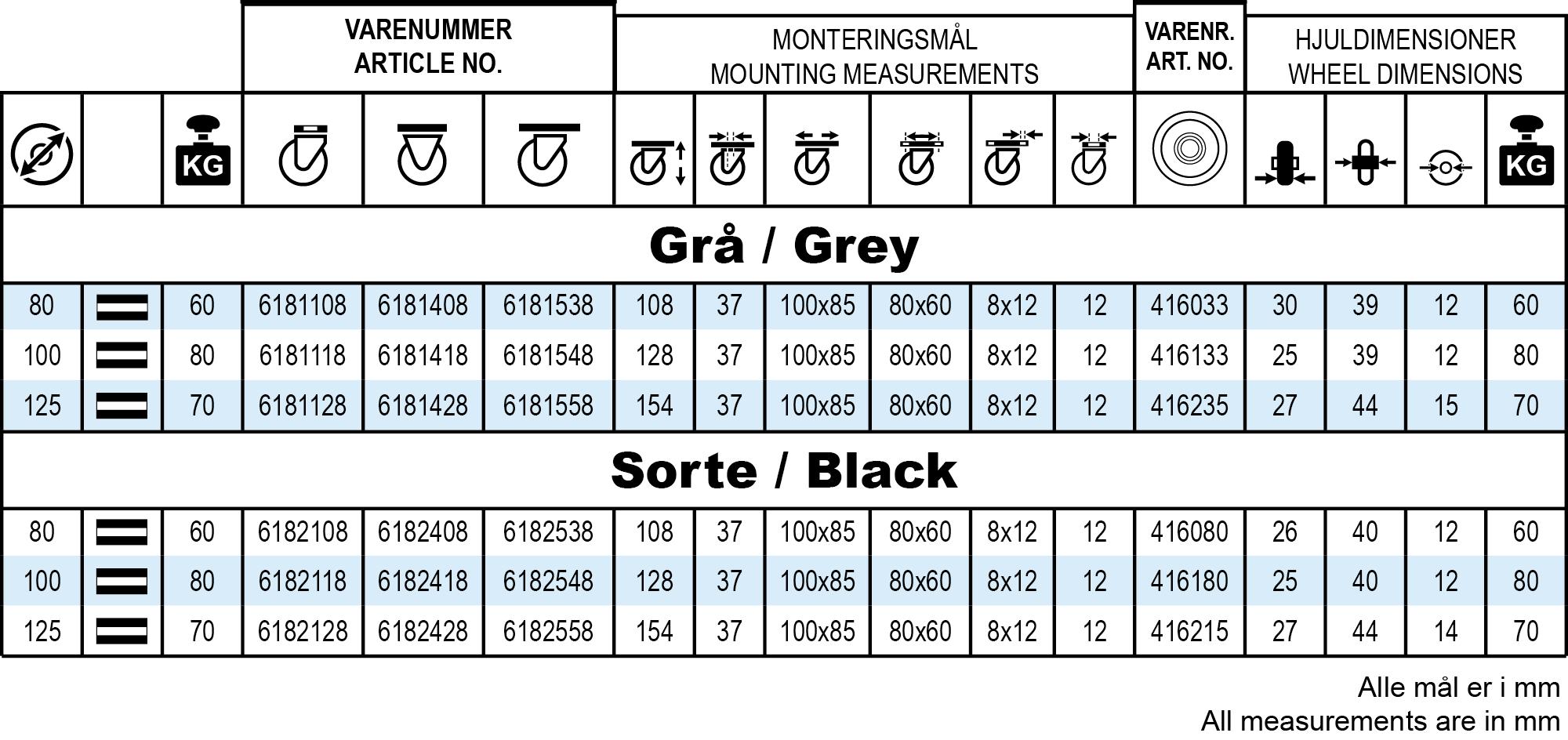 I tabellen nedenfor ses vores standardsortiment, men de kan også leveres i andre størrelser eller i gafler med bremse på forespørgsel.