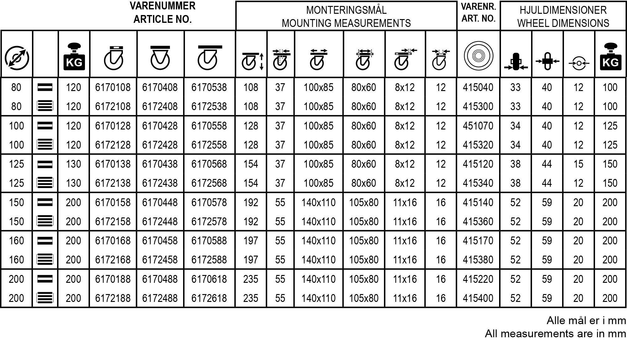 Varmebestandige, sorte termoplastiske kunststofhjul shore 62D +/-2. Rullelejemodeller er med rustfrit leje.