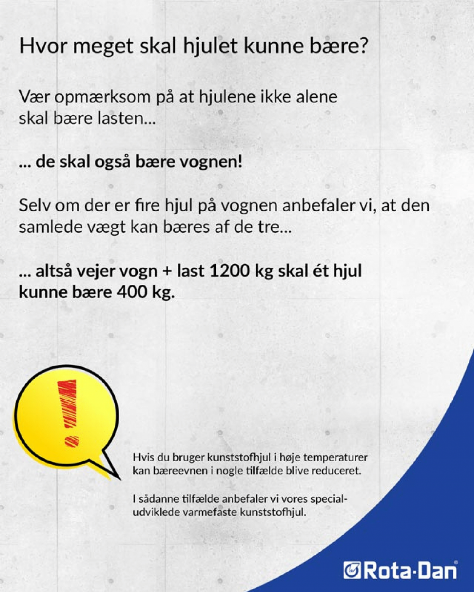 Nogle forhold kan påvirke hjulets egenskaber negativt. Hvis du fx bruger dine hjul i høje temperaturer, kan bæreevnen i nogle tilfælde blive reduceret. I sådanne tilfælde anbefaler vi vores specialudviklede varmefaste hjul.