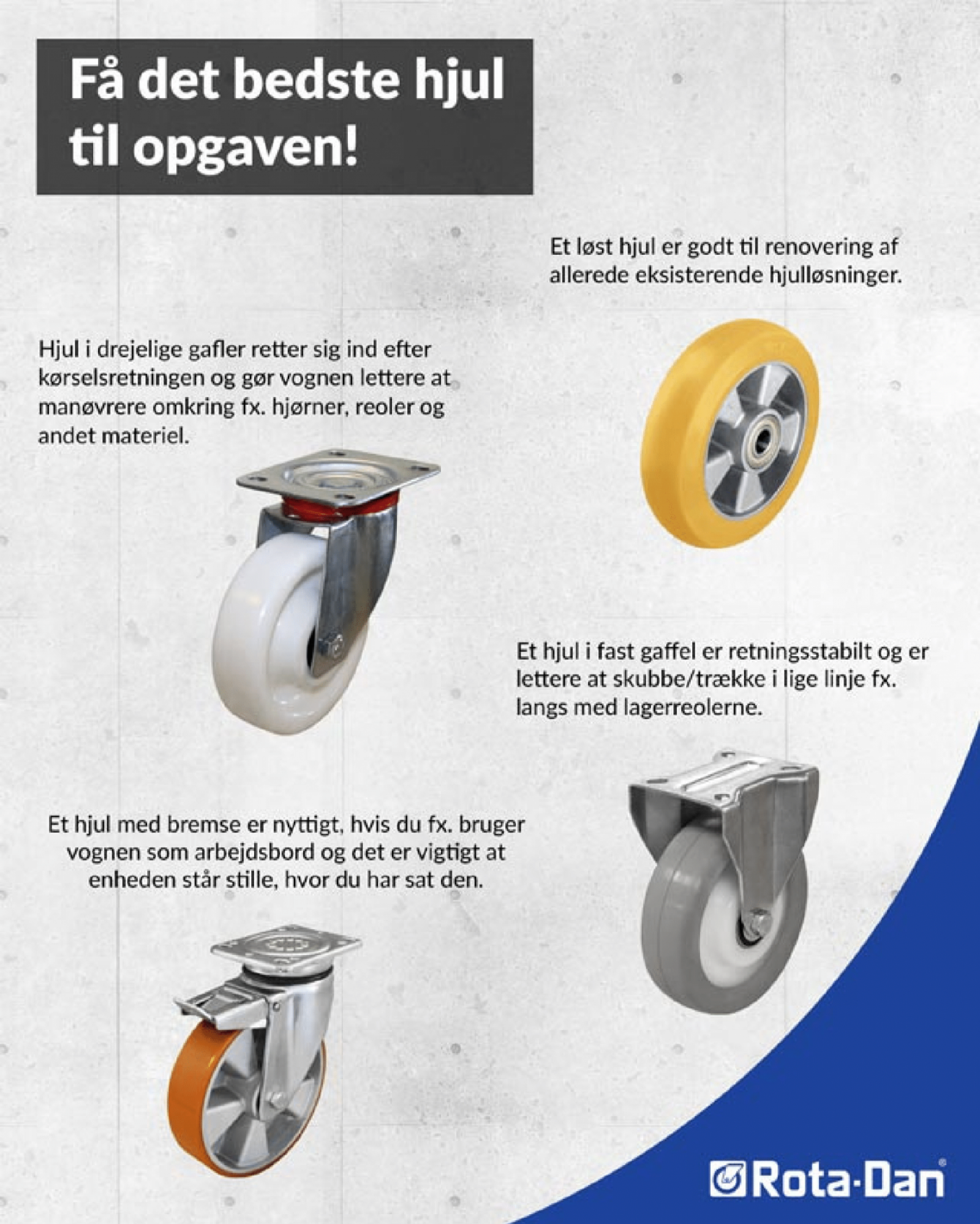Drejelige hjul eller faste hjul? Hjul med eller uden bremse?