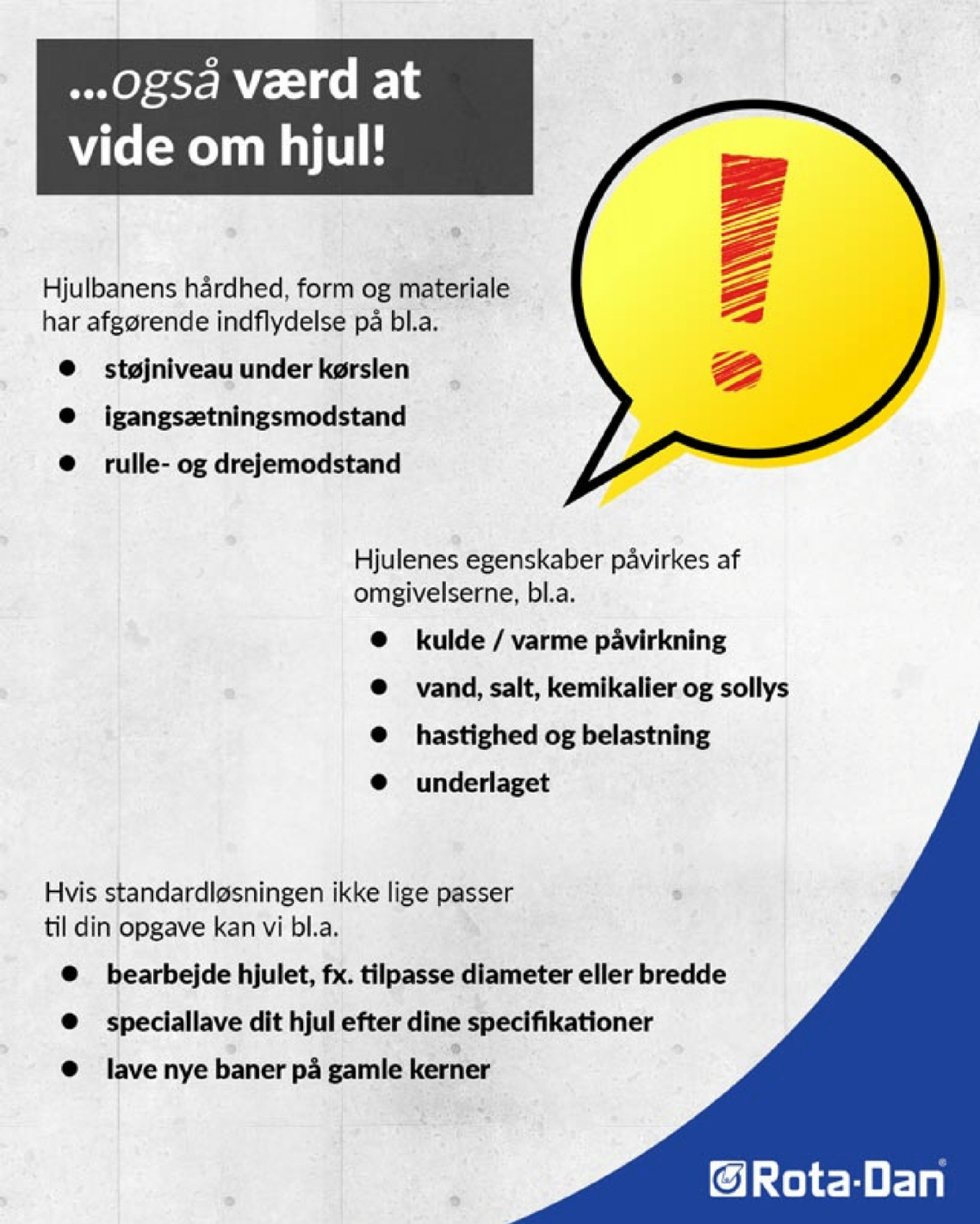 “ Vi laver også hjul specialdesignet til dine behov. Tag et kig på vores side med speciallavede hjul og se udvalget af kundespecifikke hjulløsninger. ”Ring til os på +45 98 14 77 77